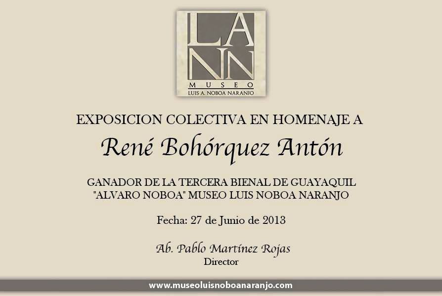 Exposición Colectiva en Homenaje a René Bohórquez Antón Ganador de la Tercera bienal de Guayaquil "Álvaro Noboa" Museo Luis Noboa Naranjo Fecha: 27 de Junio de 2013 Dirección: P. Icaza 302 y Có [...]