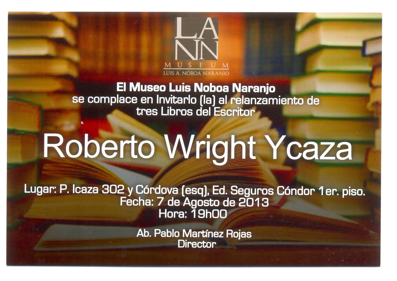 Read MoreEl Museo Luis Noboa Naranjo se complace en Invitarlo(la) al relanzamiento de tres Libros del Escritor Roberto Wright Ycaza Lugar: P. Icaza 302 y Córdova (esq), Ed. Seguros Cóndor 1er. piso. Fecha: 7 d [...]